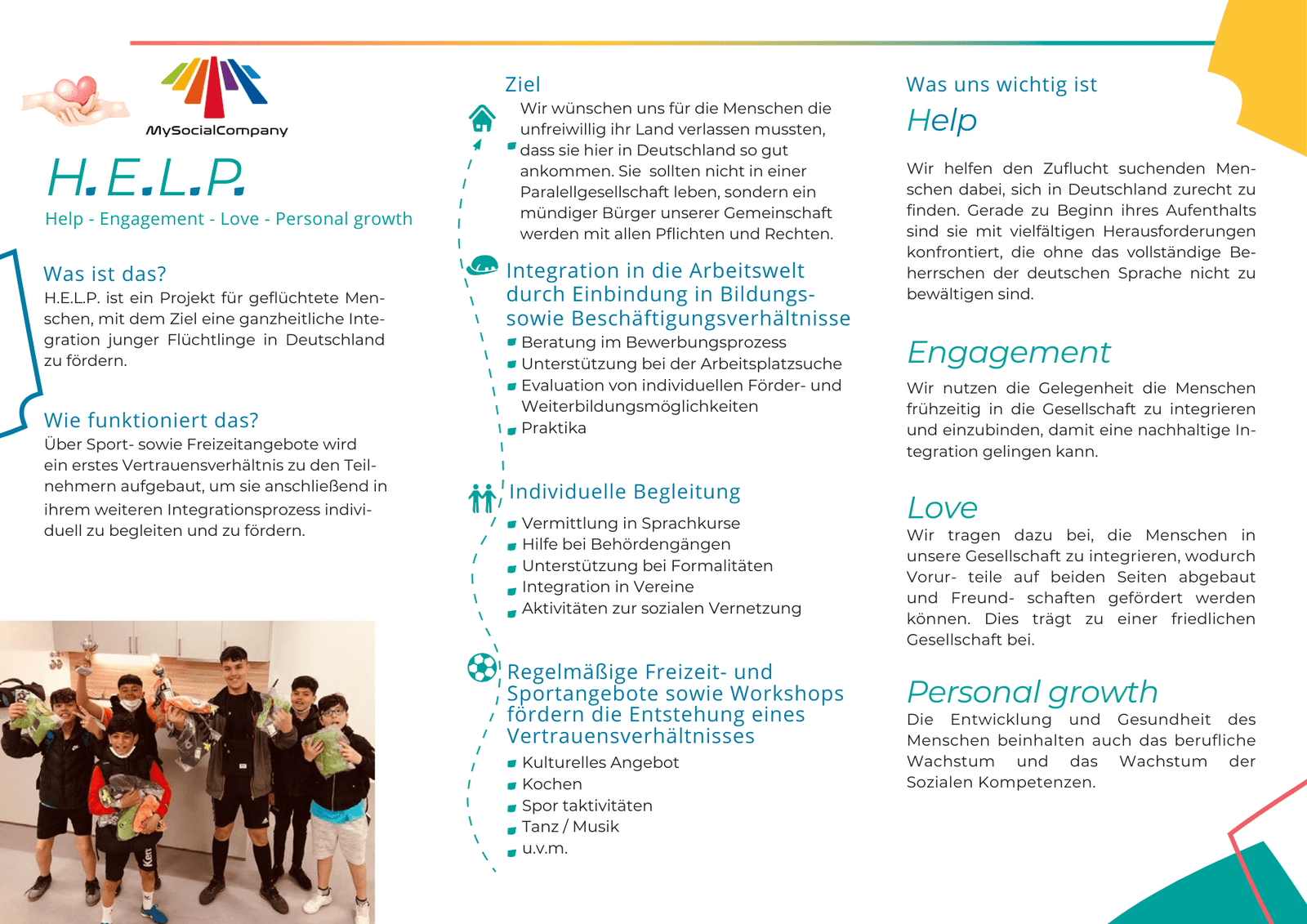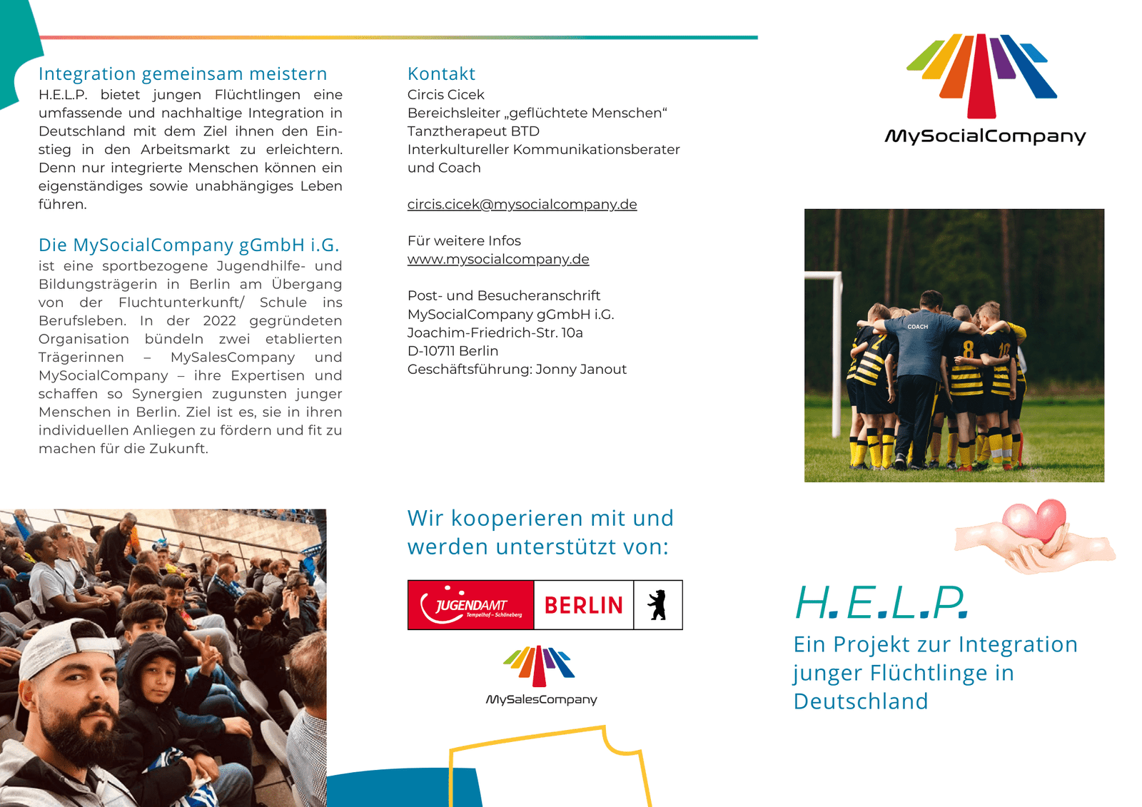 🚀 Authentisches Storytelling & Wertekommunikation: Gestaltung mit Herz: das Leitbild („sportbezogene Jugendhilfe“, „soziale Kompetenzen“, Integration) steht im Fokus, visuell und textlich stark und klar.
